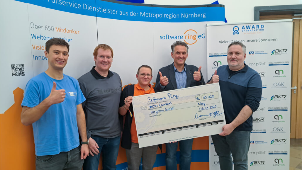 targenio wurde mit dem Award of Innovation by Software Ring e.G. ausgezeichnet. Unter fünfzehn Bewerbern aus der Metropolregion Nürnberg überzeugte das Unternehmen mit seiner innovativen Lösung für den digitalen Kundenservice. Für das Team ist der Preis weit mehr als eine Auszeichnung. Geschäftsführer Michael Kolbenschlag bringt es auf den Punkt: „Diese Auszeichnung motiviert uns und spornt uns an!“